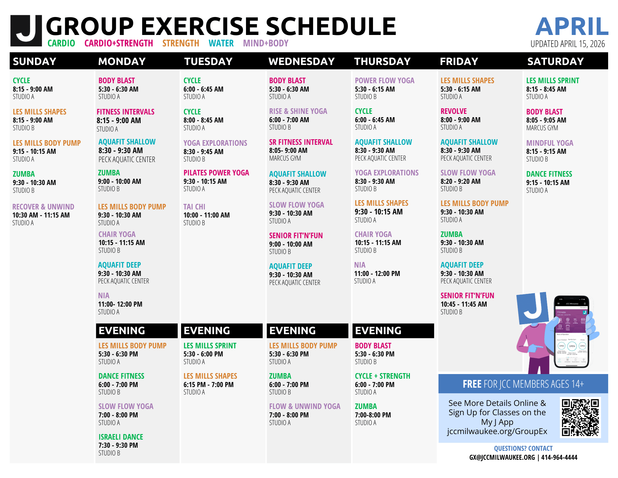 See our schedule of Group Exercise classes for members below or click here. JCC Members are encouraged to download the My J app which is the easiest way to check the Group Ex schedule and reserve your spot.